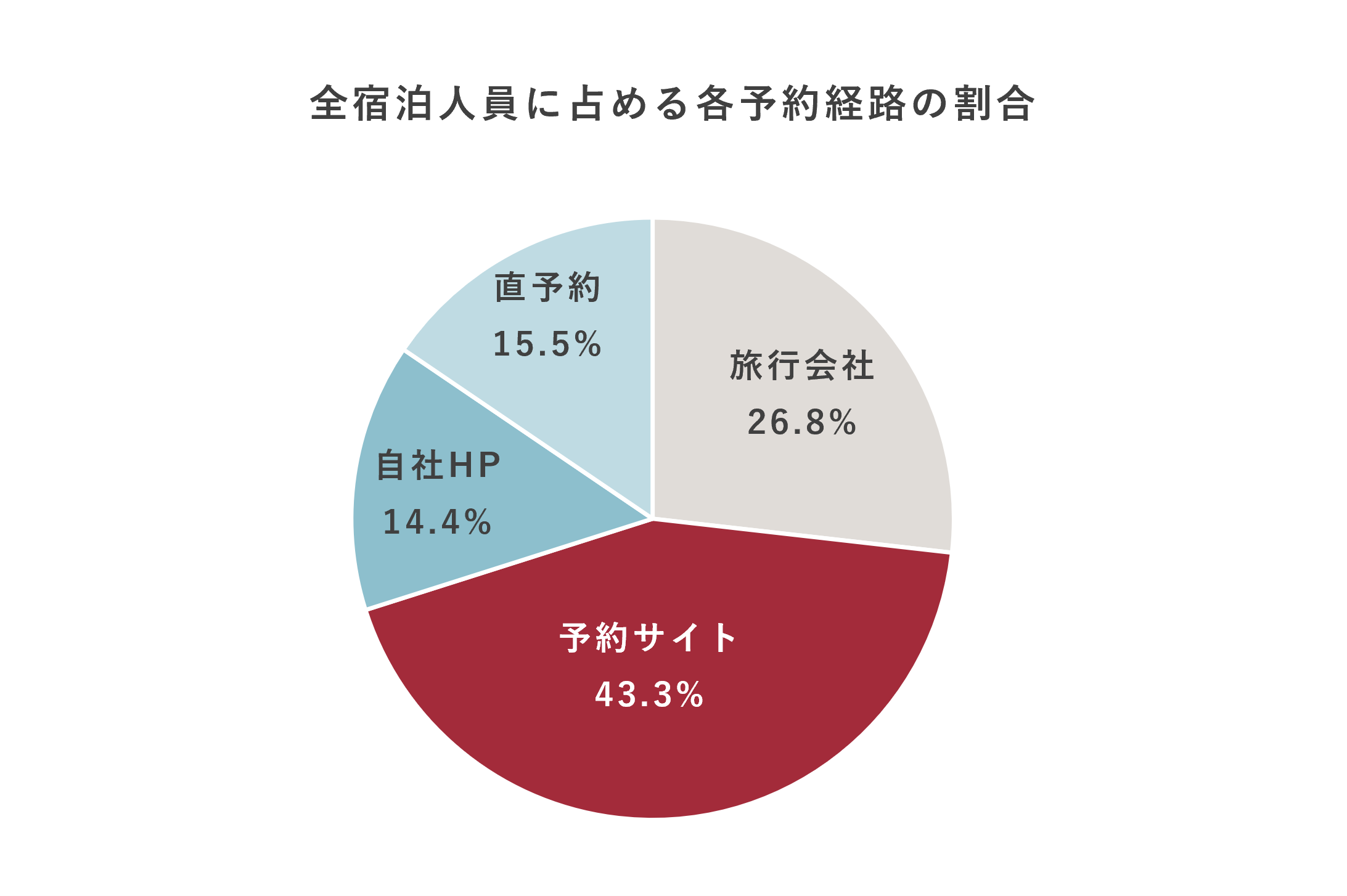 日本旅行協会の「令和5年度 営業状況等統計調査」によると、全宿泊人員のうちOTA経由での宿泊人員の割合は43.3%となり、多くの宿泊施設にとって集客の軸になっていることがわかります。