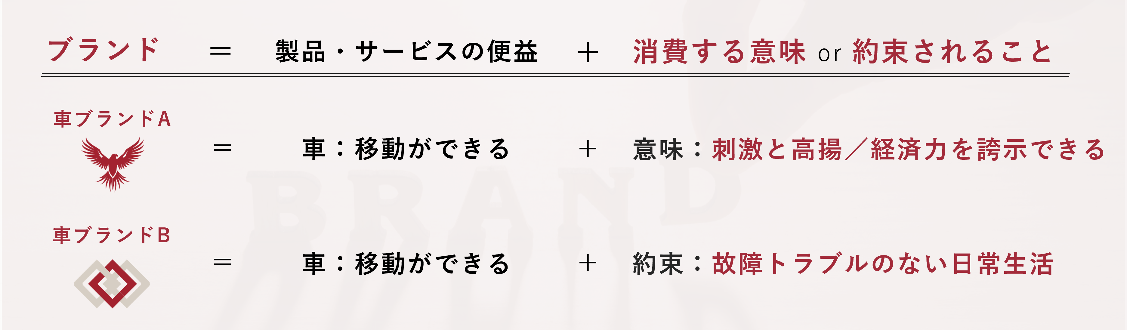 まとめると、製品・サービスの機能(車:移動ができる)にプラスαで「意味(安心できる・運転しやすい)」もしくは、「約束ごと(故障が少ない)」という独自の連想が付随し、ロゴなどの有形物や固有名称と結びつき、その人の記憶に定着している束が『ブランド』です。