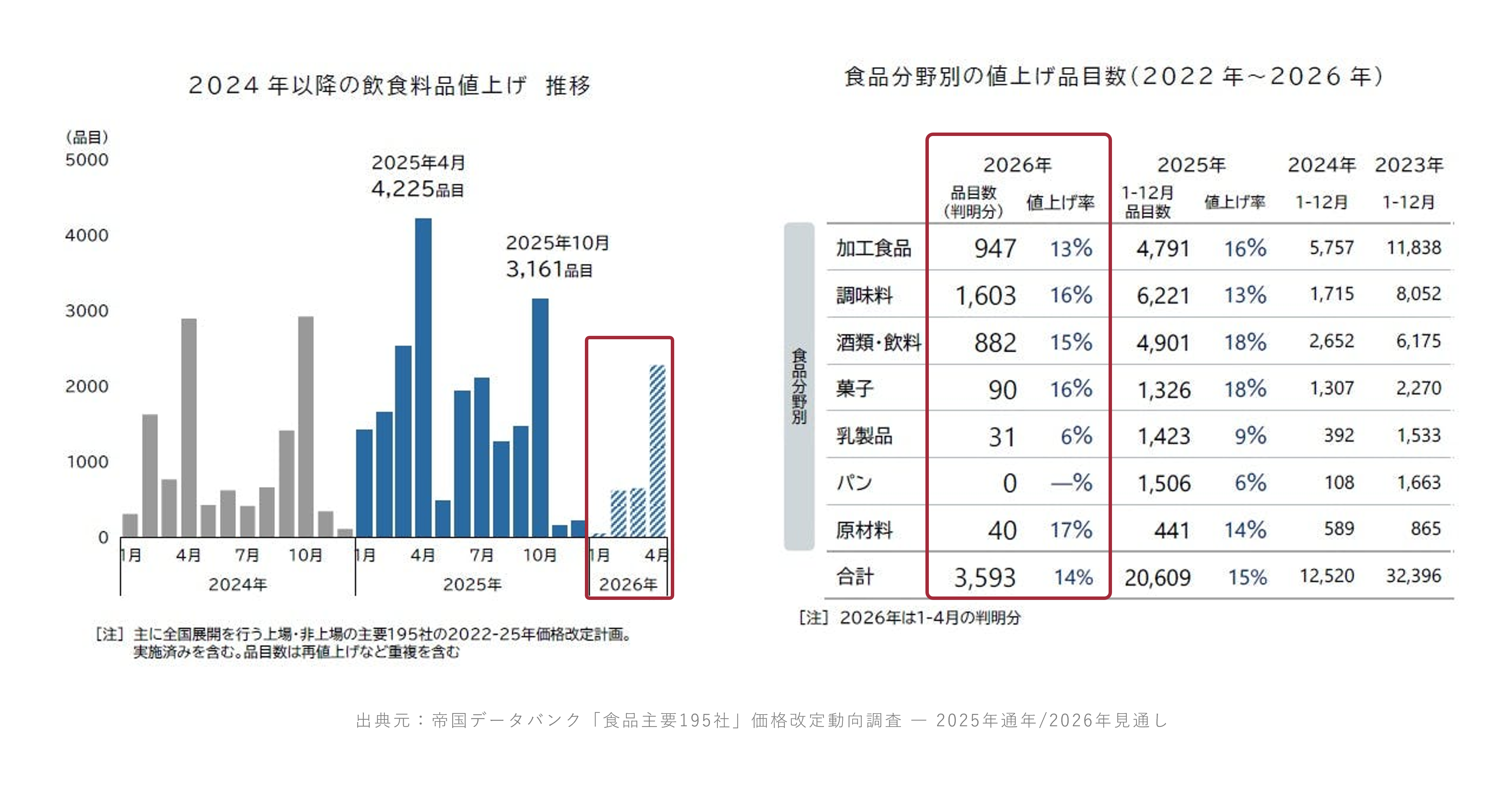 食品の値上げは、一時的なことではなく、高い状態が続く「固定条件」となります。帝国データバンクの調査によると、2026年1月~4月に判明している食品の値上げは約3,600品目で、これは前年同時期と比べると4割減となり、やや落ち着いています。現時点で判明している値上げ品目の中心は、冷凍食品や米製品、マヨネーズなどの鶏卵製品、酒類などで、平均15%前後の値上げです。
